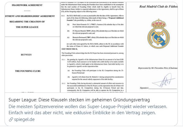 Die meisten Spitzenvereine wollen das #SuperLeague-Projekt wieder verlassen. Einfach wird das aber nicht, wie exklusive Einblicke in den Vertrag zeigen. (S+)https://t.co/SmMdJTJalr