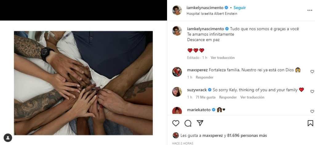 Y hoy, momentos después de oficializarse su deceso, Kelly difundió una fotografía muy especial, donde se ven las manos de Pelé y sobre ellas las de sus hijos, como muestra de unión familiar y con ella un mensaje especial.