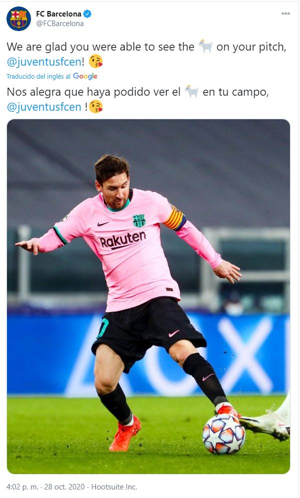 “Nos alegra que hayan podido ver al mejor de todos los tiempos en su campo, Juventus”, publicó el club catalán en su cuenta oficial de Twitter en su versión en inglés y agregó el emoji de la cabra (GOAT, greatest of all times) para referirse a Messi.