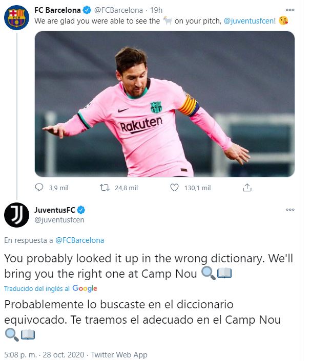 “Probablemente lo buscaste en el diccionario equivocado. Te llevamos el adecuado al Camp Nou”, dando a entender que el verdadero “GOAT” es Cristiano Ronaldo y que seguramente viaja a Barcelona para la revancha entre los equipos que integran el Grupo G de la Champions League y que disputan la clasificación con equipos como Dinamo Kiev de Ucrania y Ferencvarosi de Hungría.