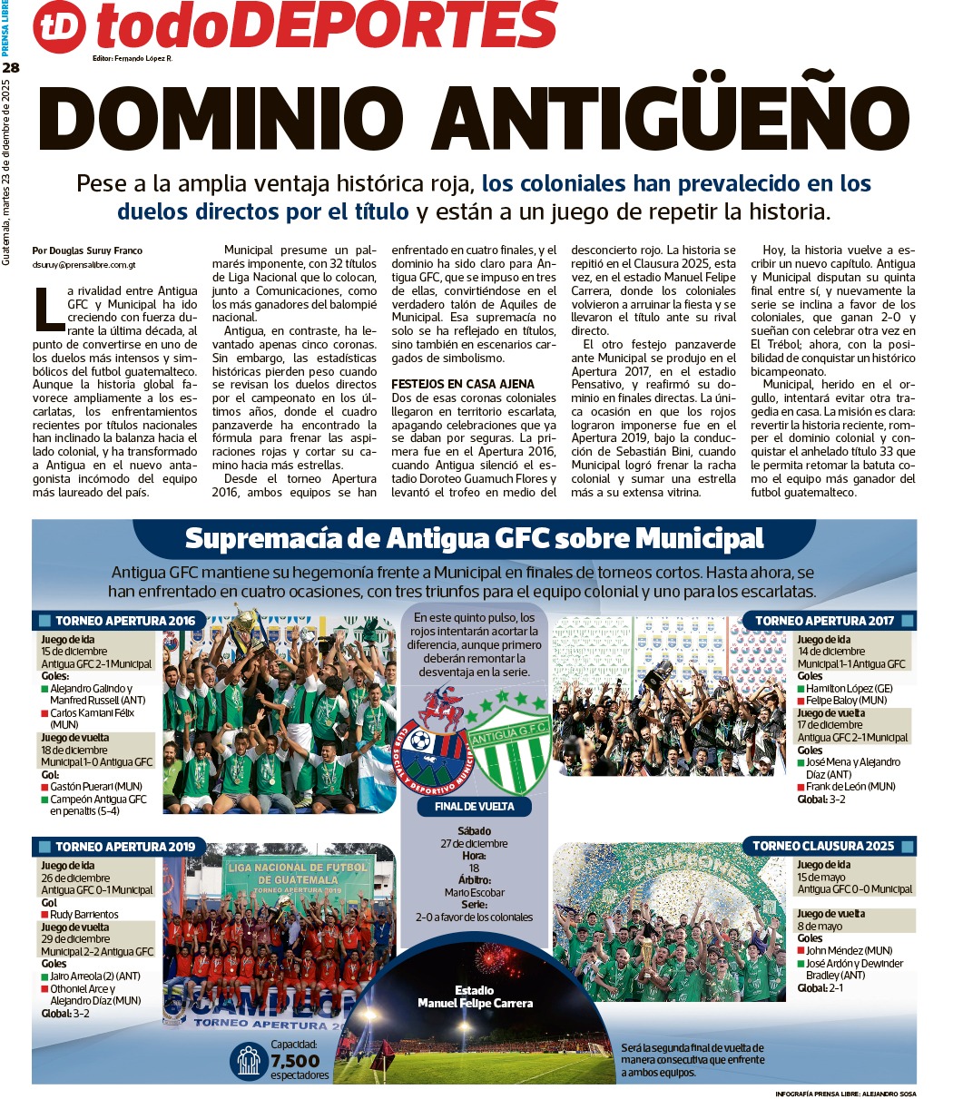 Hoy, la historia vuelve a escribir un nuevo capítulo. Antigua y Municipal disputan su quinta final entre sí, y nuevamente la serie se inclina a favor de los coloniales, que ganan 2-0 y sueñan con celebrar otra vez en El Trébol; ahora, con la posibilidad de conquistar un histórico bicampeonato.