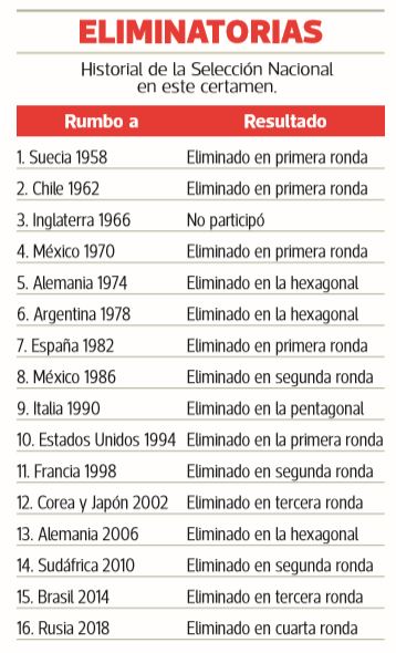 Después de su afiliación a la Fifa en 1946, Guatemala se ha presentado a 15 eliminatorias y competido en dos. En la mayoría de esos eventos, desde la eliminatoria rumbo a Suecia 1958 hasta Rusia 2018, la selección nacional ha caído en la primera fase.