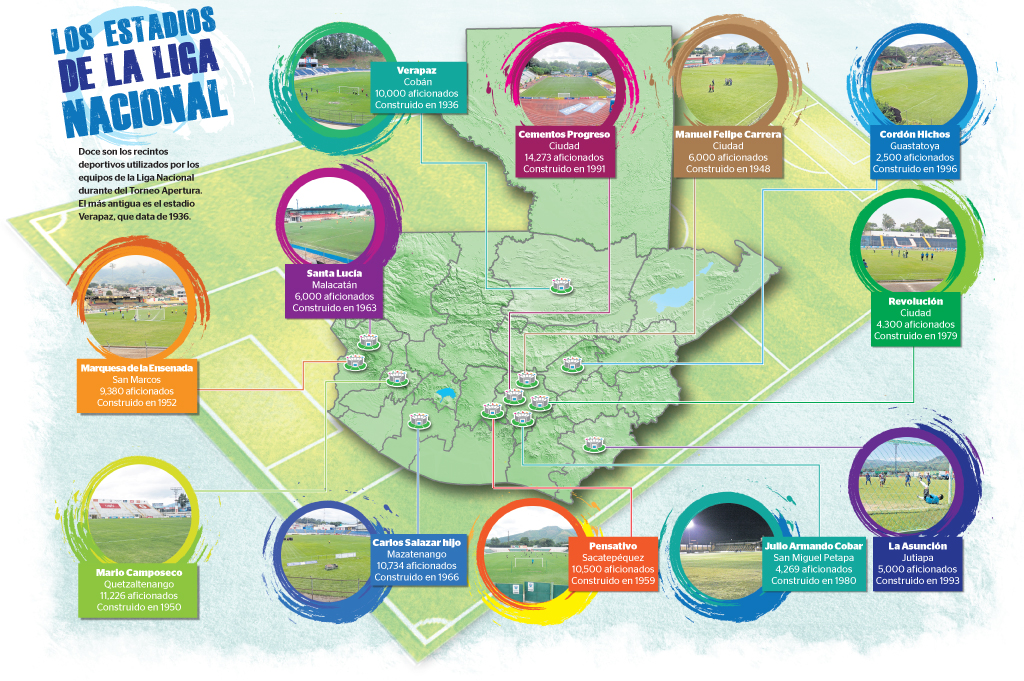 Para el torneo Apertura 2015, los 12 escenarios de los equipos que militan en la Liga Nacional han comenzado a cobijar, con fortalezas y debilidades, el frenesí del balompié guatemalteco.