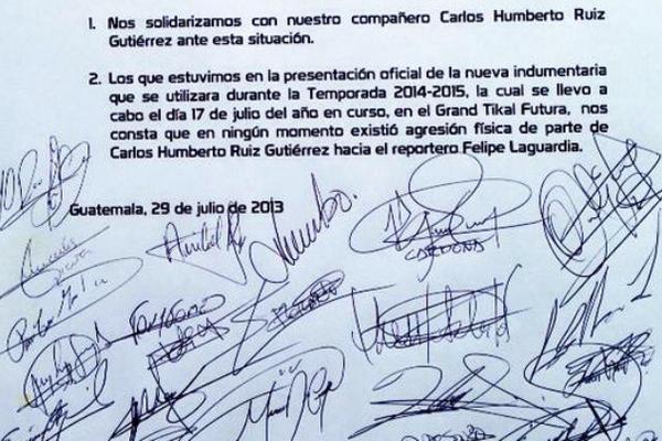 “Los que estuvimos en la presentación oficial de la nueva indumentaria que se utilizará durante la Temporada 2014-2015, la cual se llevó a cabo el día 17 de julio del año en curso, en el Grand Tikal Futura, nos consta que en ningún momento existió agresión física de parte de Carlos Humberto Gutiérrez, hacia el reportero Felipe Laguardia”, agrega la misiva.