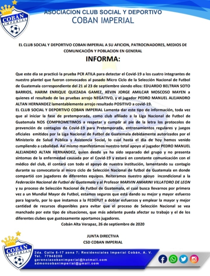 El club además instó a la Federación Nacional de Fútbol de Guatemala (FEDEFUT) a reforzar acciones y emplear mayores recursos para evitar contagios durante las convocatorias porque puede afectar su trabajo y el de los clubes que aportan jugadores.