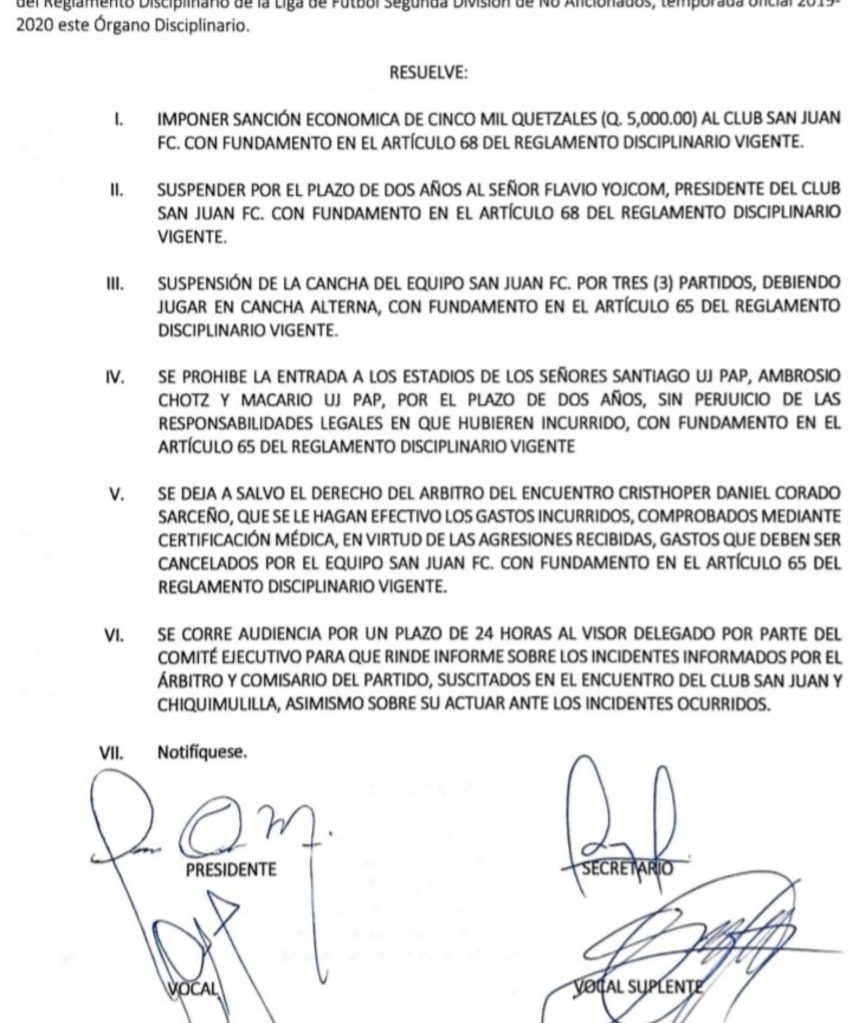 El Órgano Disciplinario de la Segunda División del Futbol de Guatemala suspendió por dos años de toda actividad futbolística al presidente del Deportivo San Juan FC, Flavio Yojcom, que también es el alcalde del municipio de San Juan La Laguna, Sololá, por los hechos que desencadenaron en una agresión al equipo arbitral que dirigía Cristhoper Daniel Corado Zarceño.