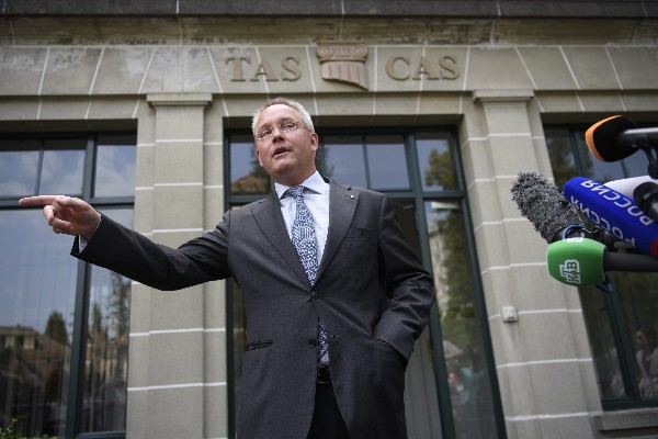El secretario general del Tribunal de Arbitraje Deportivo (TAS), Matthieu Reeb, durante una rueda de prensa delante del edificio del organismo en Lausana, Suiza. (Foto Prensa Libre: EFE)