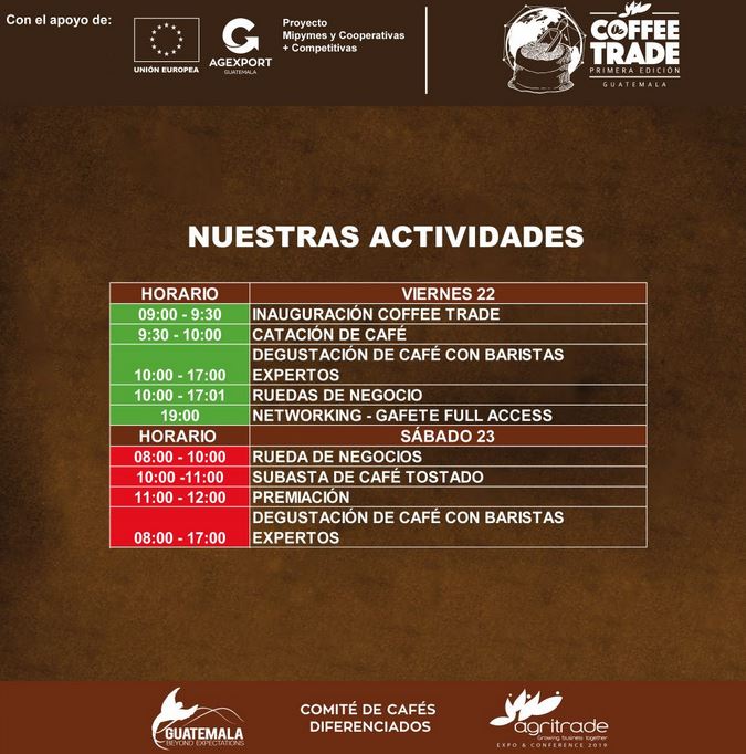 Para adquirir las entradas a las más de 10 actividades que se llevarán a cabo en la 19ava. Edición de AGRITRADE Expo & Conference pueden comprarlas online en: https://agritradecentralamerica.org. Asi mismo, para mayor información del Coffee Trade de AGEXPORT, los interesados pueden comunicarse al número de teléfono: 24223400.