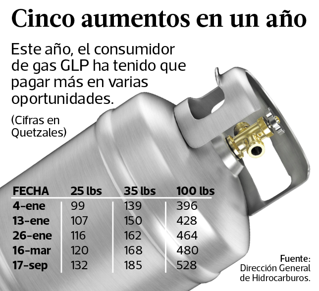 El cilindro de 25 libras -que es el de mayor consumo- pasó de Q120 a Q132 con un ajuste de Q12; el de 35 libras, subió de Q168 a Q185 o sea Q17; y el tambo de 100 libras subió Q48, para situarse en Q528.