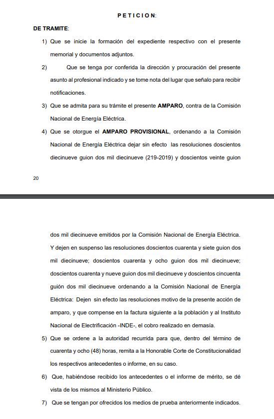 La Une también pide que se compense en la factura siguiente tanto al usuario como al Instituto Nacional de Electrificación (Inde) el cobro extra realizado, según el documento de amparo.