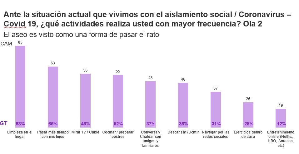 Ante la situación actual que vivimos con el aislamiento social las actividades que se llevan a cabo con mayor frecuencia son la limpieza en el hogar, que es visto como una forma de pasar el rato.