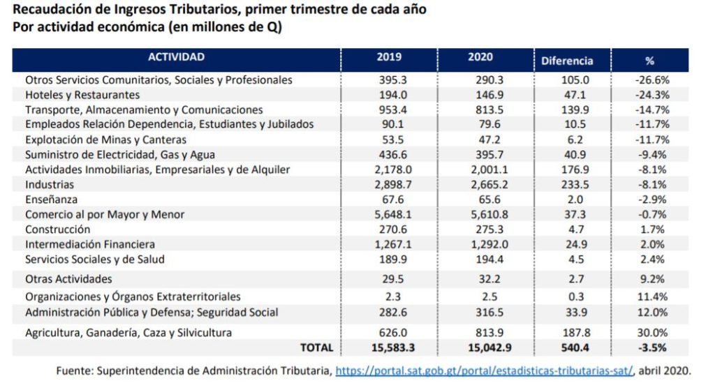 Ese rubro pasó de Q15 mil 583.3 millones acumulado de enero a marzo del 2019, a Q15 mil 042.9 millones, una diferencia de Q540.4 millones.
