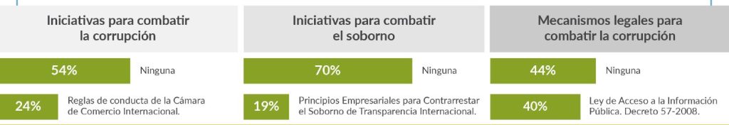 La UVG planteó que se detectaron que hay al menos 601 artículos en la legislación nacional que hablan sobre el combate, sanciones, prohibiciones para sobornos o para evitar la corrupción, pero persiste la práctica por lo que la UVG cree que debe trabajarse buenas prácticas, códigos de ética, desde las empresas.