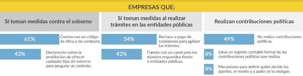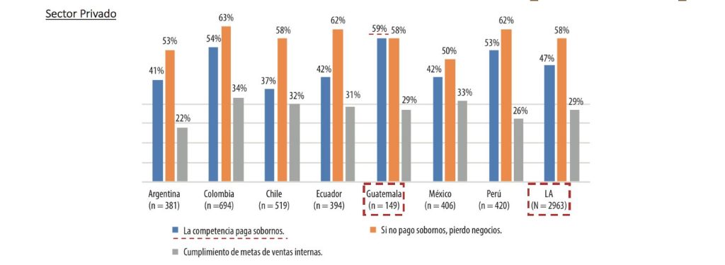 También se detectaron tres razones principales para dar el soborno según lo expresado por los empresarios entrevistados para el estudio: porque la competencia lo hace, para apoyar las ventas internas, y si no pagan pierden negocios.