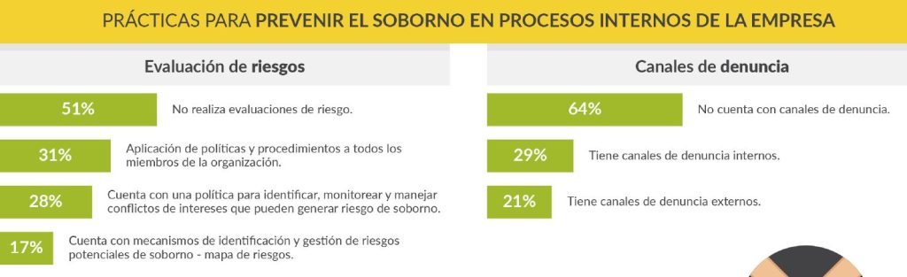 - Solís explicó que muy pocas empresas aplican procesos internos de prácticas para prevenir el soborno ya que el 51% no realiza evaluaciones de riesgo, sólo el 31% aplica política y procedimientos a toda la organización.
