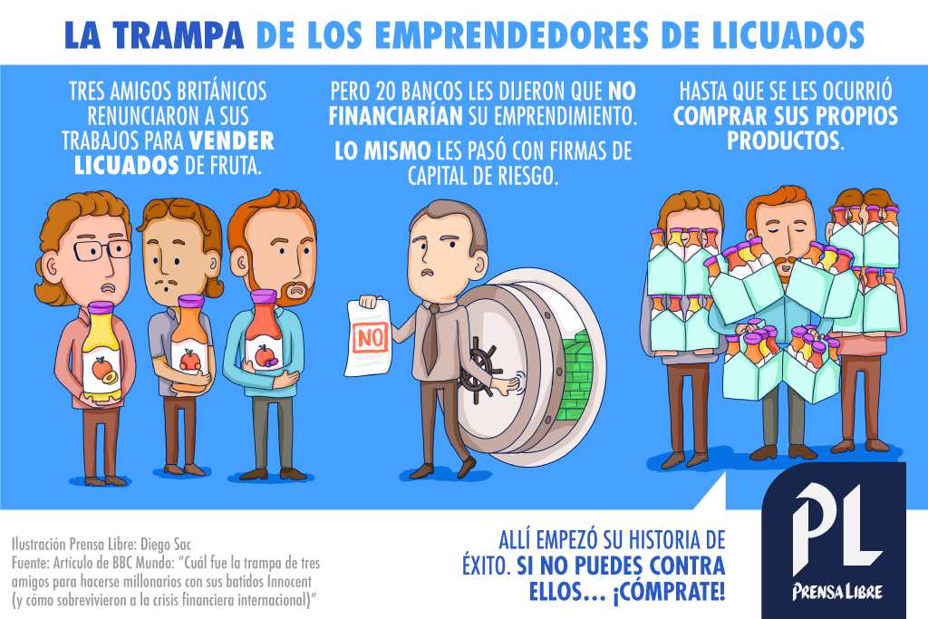 Las reiteradas negativas de las instituciones financieras obligaron a tres empresarios a hacer algo inusual y extraño, pero efectivo al fin: comprar sus propios productos. (Ilustración: Diego Sac)