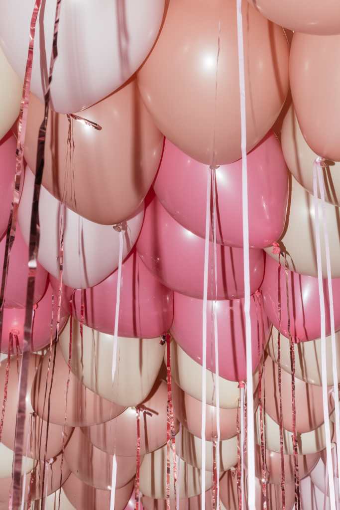 Decenas y decenas de globos en una paleta de colores neutros mate, y varios globos de colores contrastantes rayados para imitar el mármol de Carrara. Al principio, Danielian se mostró escéptico cuando su organizador de eventos, Edgar Hay, se lo propuso.