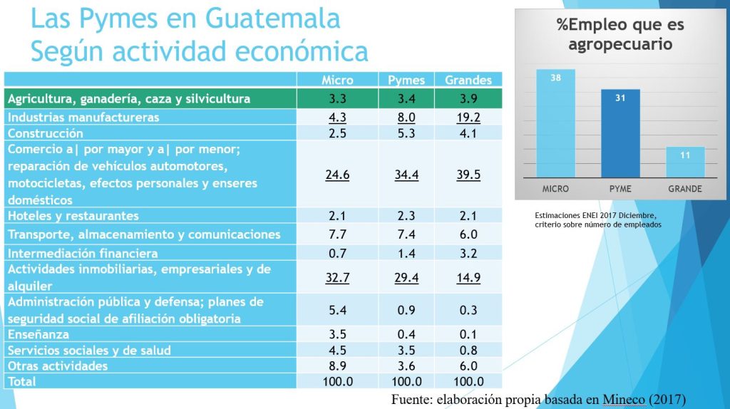 Las pymes representaron en el 2015 el 10.8%de empresas activas, y por cada Quetzal de venta ese año Q0.31 fue para empresas pymes. Este segmento generan el 17.2% de empleos según la Encuesta Nacional de Empleos e Ingresos (Enei) del 2017, dijo Cabrera.