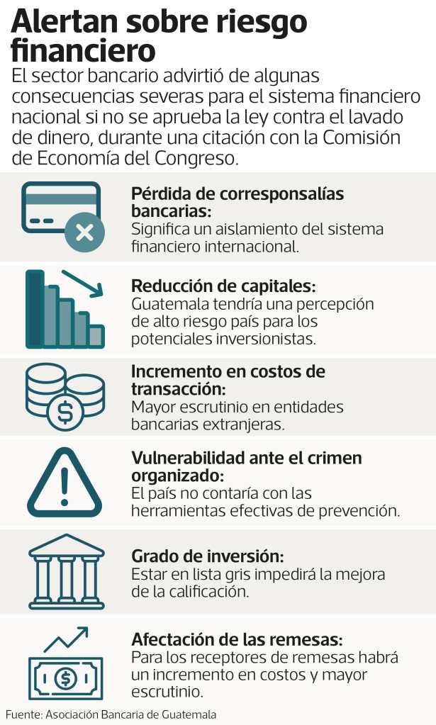 El sector bancario y financiero alertó de los riesgos para Guatemala en caso de que no se apruebe la iniciativa de ley que actualiza el combate al lavado de dinero, una exigencia internacional.