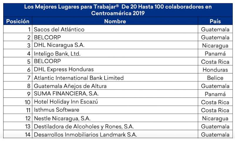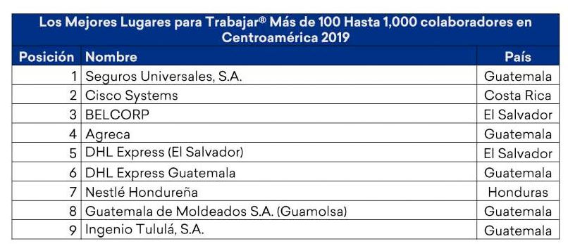 Los mejores lugares para trabajar de más de 100 a 1 mil colaboradores en Centroamérica de 2019 son: En esta categoría Prensa Libre ocupa el puesto 39 de 73 empresas.