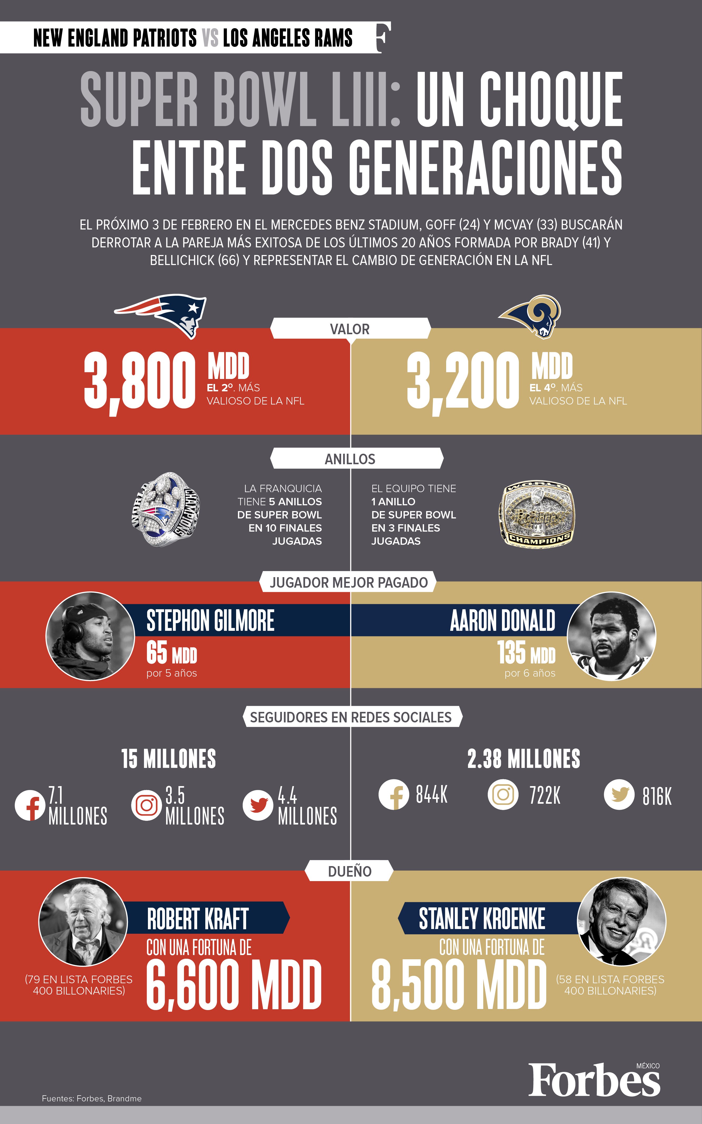Además, dentro del terreno de juego, la otra pieza vital para una de las dinastías más importantes de la NFL, Tom Brady, a sus 41 años, busca su sexto anillo en nueve finales. Su rival, el joven Jared Goff, mariscal de campo del equipo californiano, con 24 años también disputa su primera final.