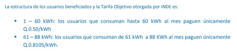 - Según datos de la Comisión Nacional de Energía Eléctrica (CNEE) actualizada al 31 de enero del 2020, la Tarifa Social se aplica a 2.8 millones de familias que equivale al 94% de usuarios del país.