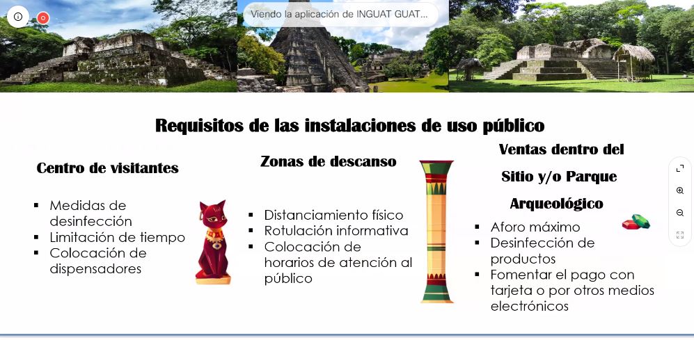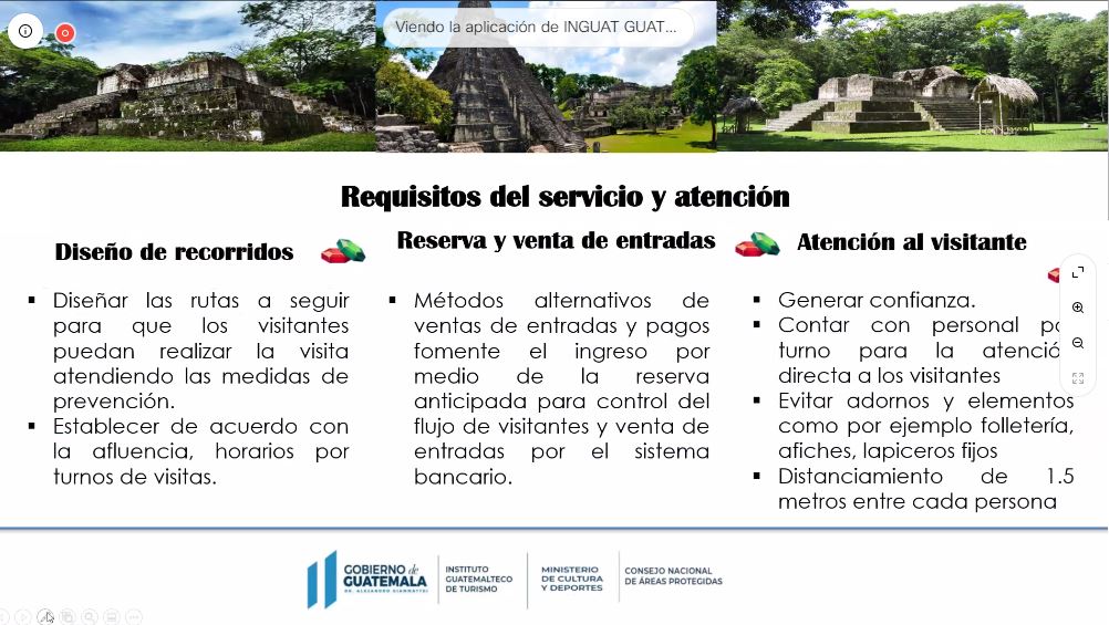 El Inguat en conjunto con El Ministerio de Cultura y Deportes -MCD- a través de Viceministerio de Patrimonio Cultural y Natural, y el Consejo Nacional de Áreas Protegidas -CONAP- desarrolló los documentos, cuyo contenido se encuentra susceptible a adaptaciones según sea requerido.