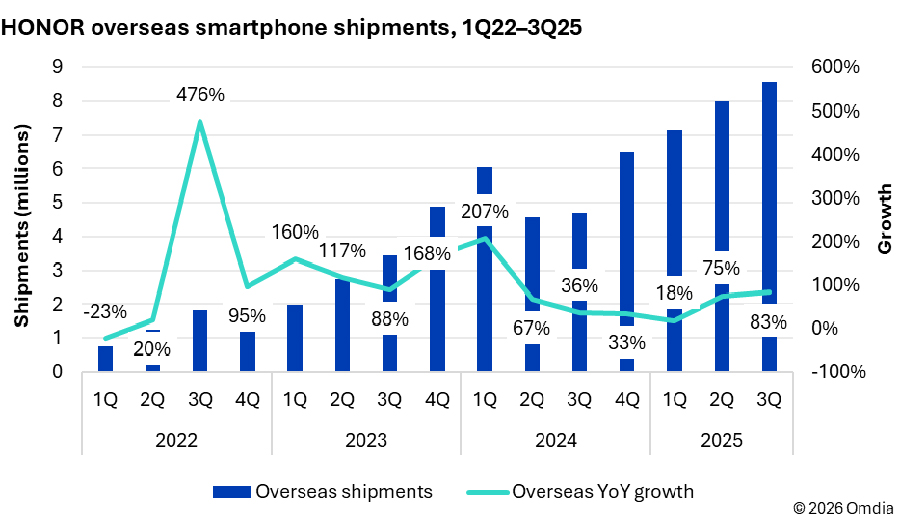 Esta expansión representa una transformación estructural significativa para HONOR, a principios de 2021, los envíos en mercados internacionales representaban menos del 10% del volumen global de la compañía, y para el tercer trimestre de 2025, esta cifra había aumentado a casi el 50%, marcando un punto de inflexión claro en la evolución del negocio.