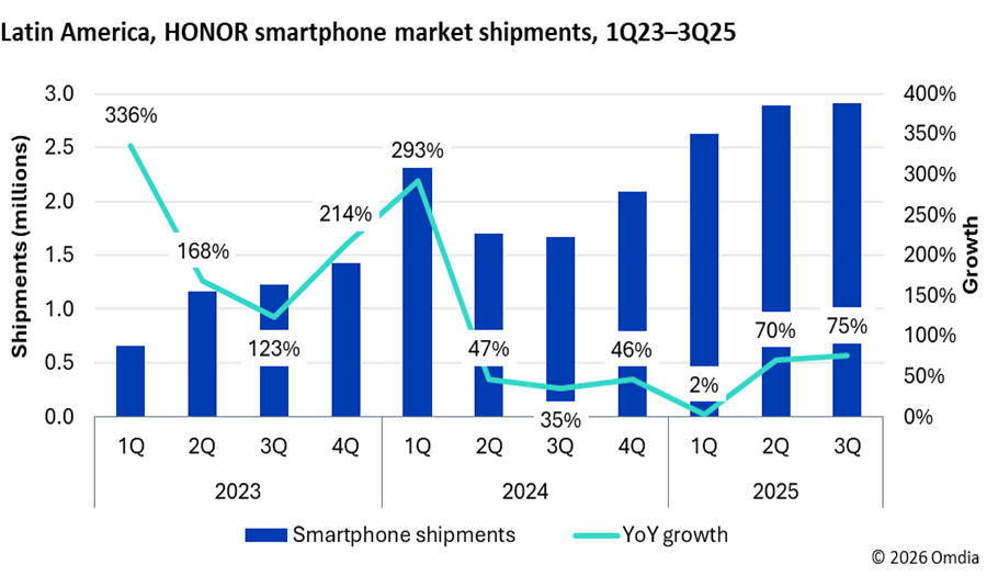 Latinoamérica se posiciona como el pilar de volumen internacional de HONOR, con crecimientos de hasta 478% en mercados clave. Esto lo convierte como el fabricante de smartphones con mayor crecimiento en mercados internacionales durante 2025, con una expansión del 55% en envíos durante los primeros tres trimestres del año, revela un informe de Omdia.
