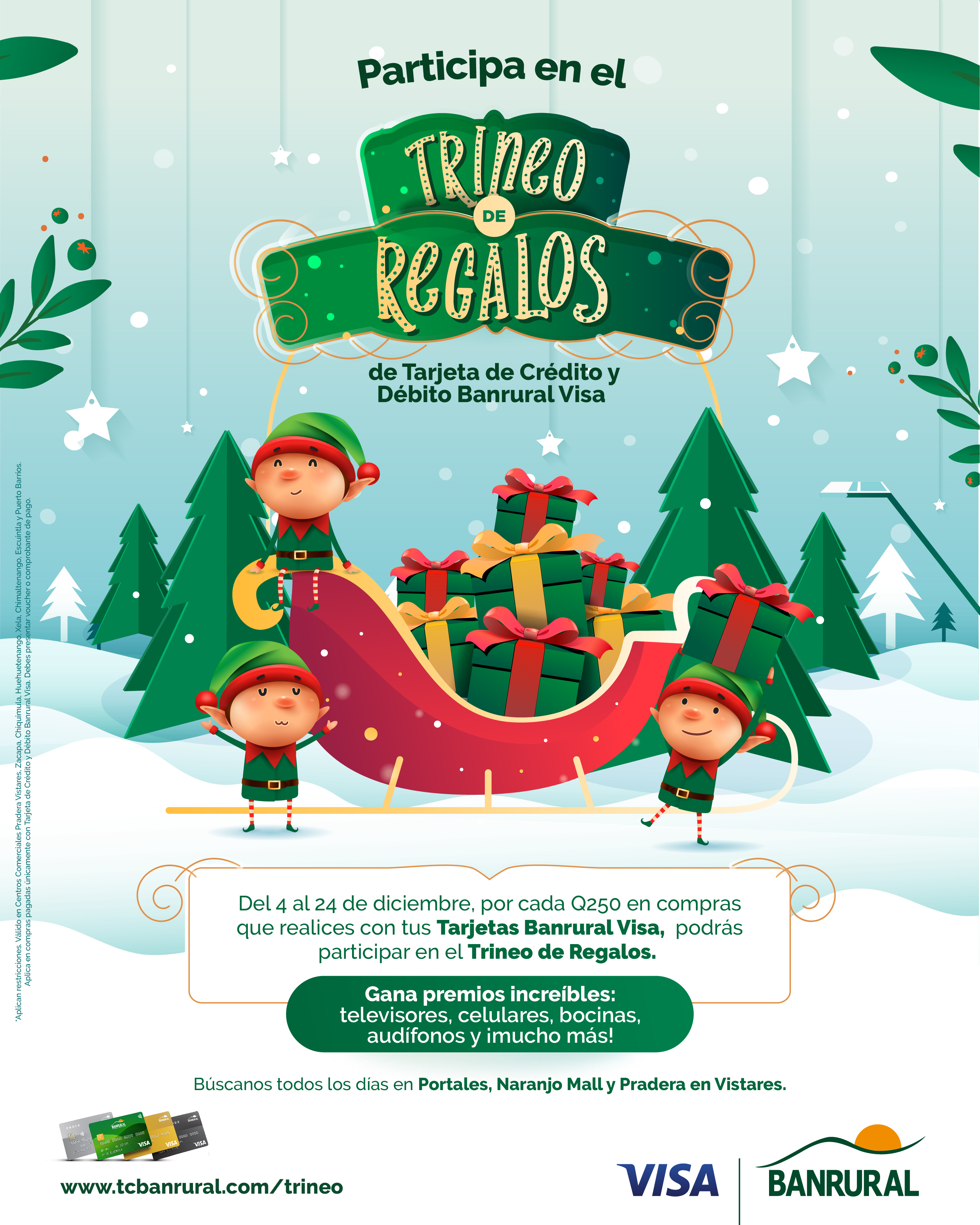 - Presentar su factura de compra y voucher o comprobante de pago con tarjeta BANRURAL VISA para participar con los duendes navideños eligiendo un regalo que puede estar premiado.
