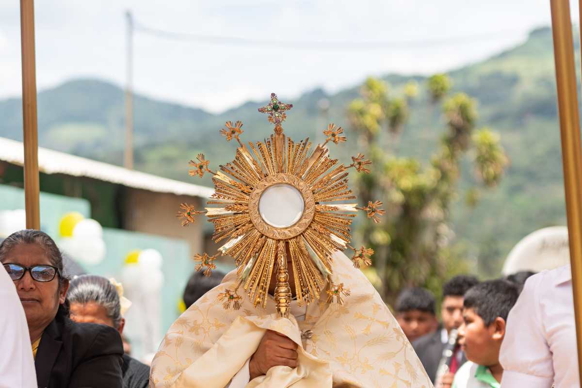 En San Vicente Pacaya del departamento de Escuintla, la celebración de Corpus Christi está a cargo de los Ministros de la Eucaristía de la Parroquia de San Vicente Mártir. (Foto Prensa Libre: Jorge Luis Mejicanos)