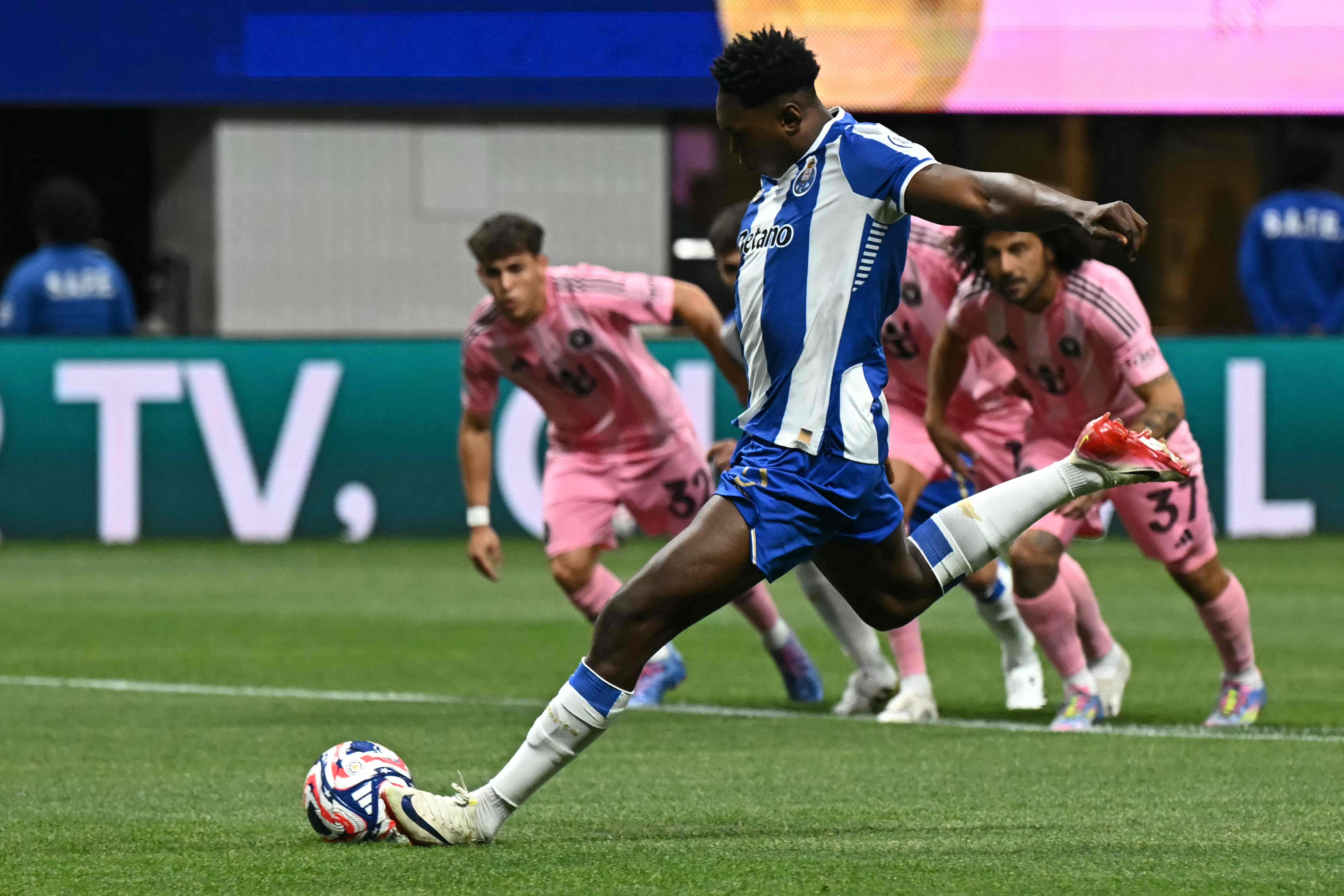 Desde el área de penalti, Samu Aghehowa del FC Porto, efectúa un disparo, venciendo al arquero del Inter de Miami. (Foto Prensa Libre: AFP)