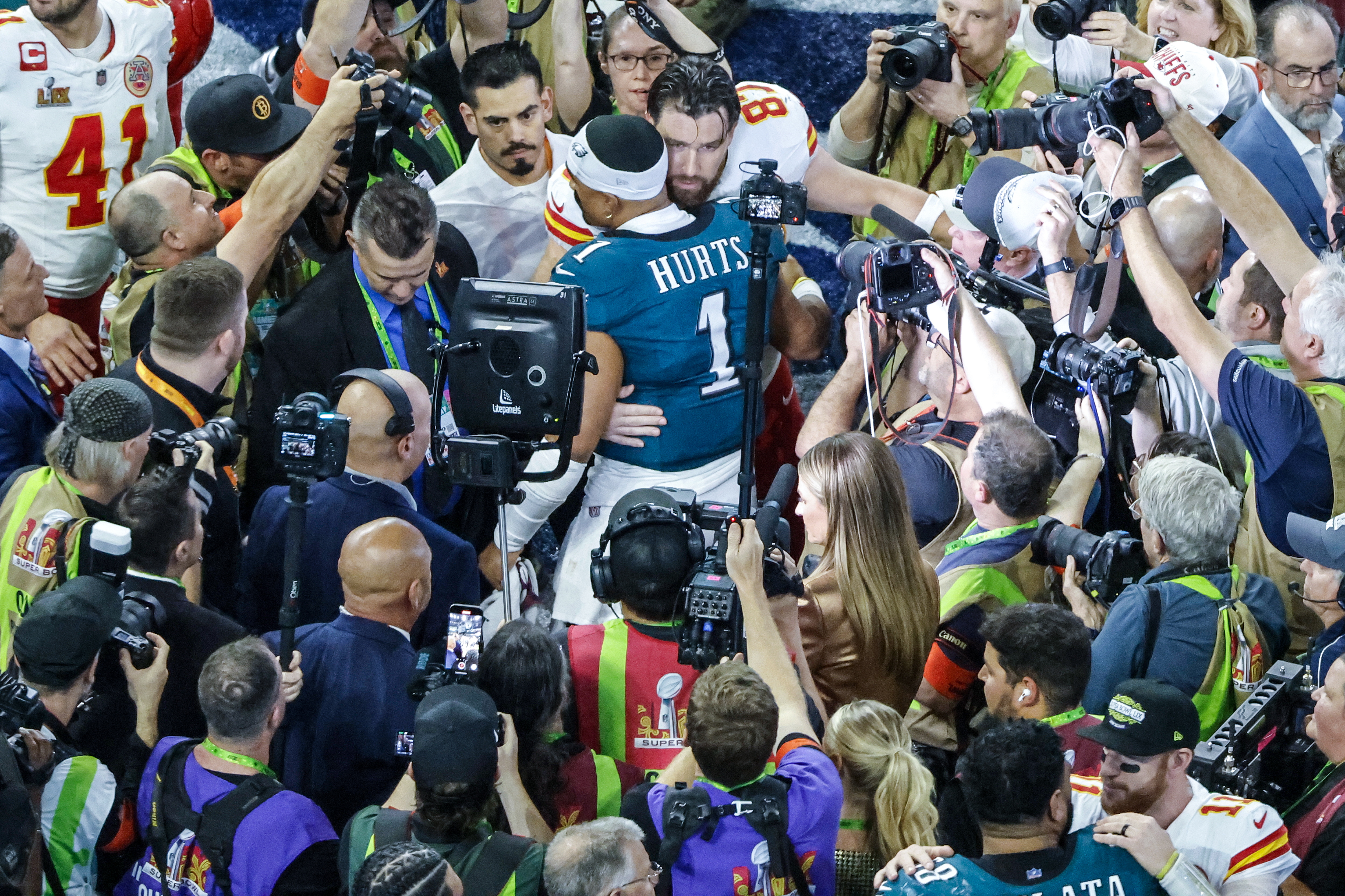 El mariscal de campo de los Philadelphia Eagles, Jalen Hurts (arriba a la izquierda) y el ala cerrada de los Philadelphia Eagles, Nick Muse (arriba a la derecha), se felicitan al final del Super Bowl LIX entre los Kansas City Chiefs y los Philadelphia Eagles. (Foto Prensa Libre: EFE)