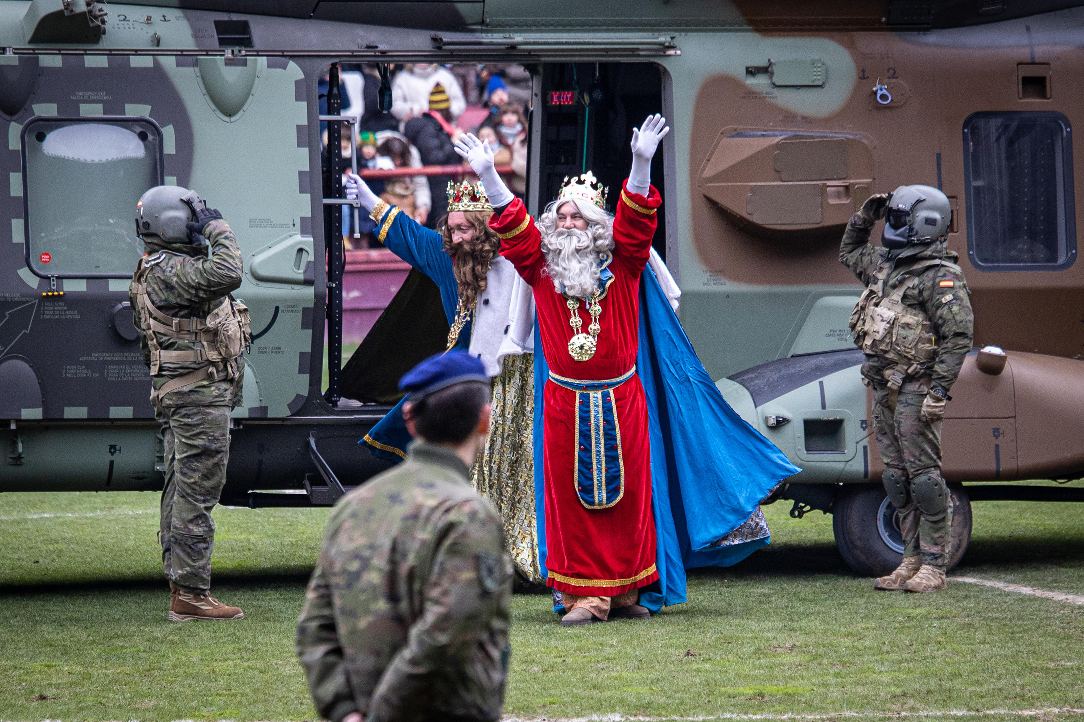 Los Reyes Magos de Oriente han llegado este domingo a Logroño tras aterrizar en el helicóptero de Maniobra Bhelma III en el centro del césped del estadio municipal Las Gaunas, Logroño, España. (Foto Prensa Libre: EFE)