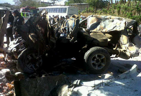 CIUDAD DE GUATEMALA – Testigos dijeron que el vehículo pesado se desplazaba de la capital hacia oriente y en una pendiente al parecer no pudo frenar, perdió el control, volcó y aplastó a los vehículos, que circulaban de oriente hacia la capital.