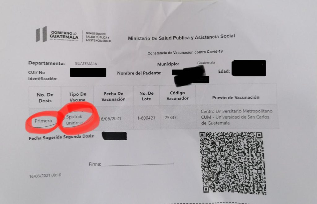 También, varios guatemaltecos que ya recibieron la inmunización han denunciado que las constancias extendidas por el ministerio indican que se les administró la vacuna “Sputnik unidosis”.