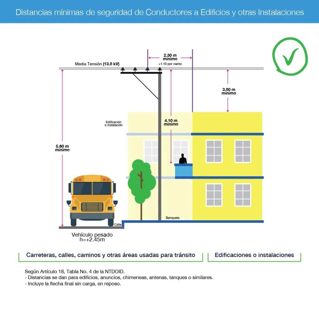 Las distancias mínimas para construir cerca del cableado eléctrico se regulan en las Normas Técnicas de Diseño y Operación de las Instalaciones de Distribución (NTDOID), aprobadas por la Comisión Nacional de Energía Eléctrica (CNEE).