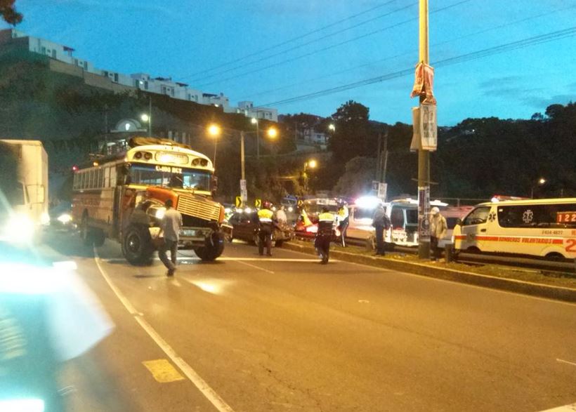Un bus de transportes Tacaná y un vehículo particular chocaron en el kilómetro 16 de la ruta Interamericana, dirección occidente, lo cual generó tránsito lento en el sector.