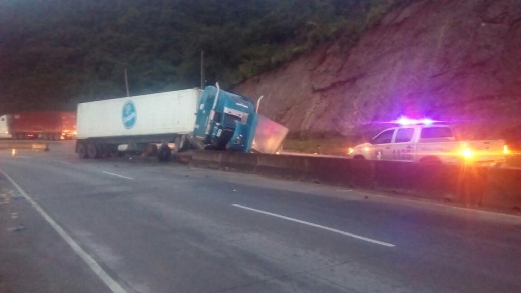 A eso de las 5.50 horas de este lunes, un tráiler que circulaba sobre el kilómetro 27 de la ruta al Atlántico, en dirección oriente,  impactó contra la barda de contención que separa los carriles en ambos sentidos.