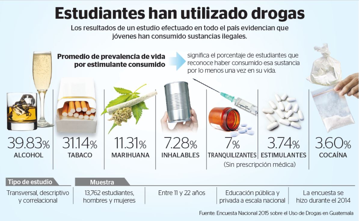 Por ser legal su venta, las drogas que los estudiantes más han consumido por lo menos una vez —indicador conocido como promedio ponderado de prevalencia de vida— son el alcohol y el tabaco, con 39.83 y 31.14 por ciento, respectivamente.