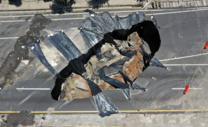 El hundimiento ocurrió el pasado 14 de junio, y en un intento por arreglar la falla las autoridades tomaron la decisión de rellenarlo con concreto líquido y lodocreto, fueron 1 mil 100 metros cúbicos los que se vertieron y que por las fuertes lluvias se lavaron, y de nuevo se formó el agujero que poco a poco se ha ido extendiendo y ahora mide 17 metros de profundidad.