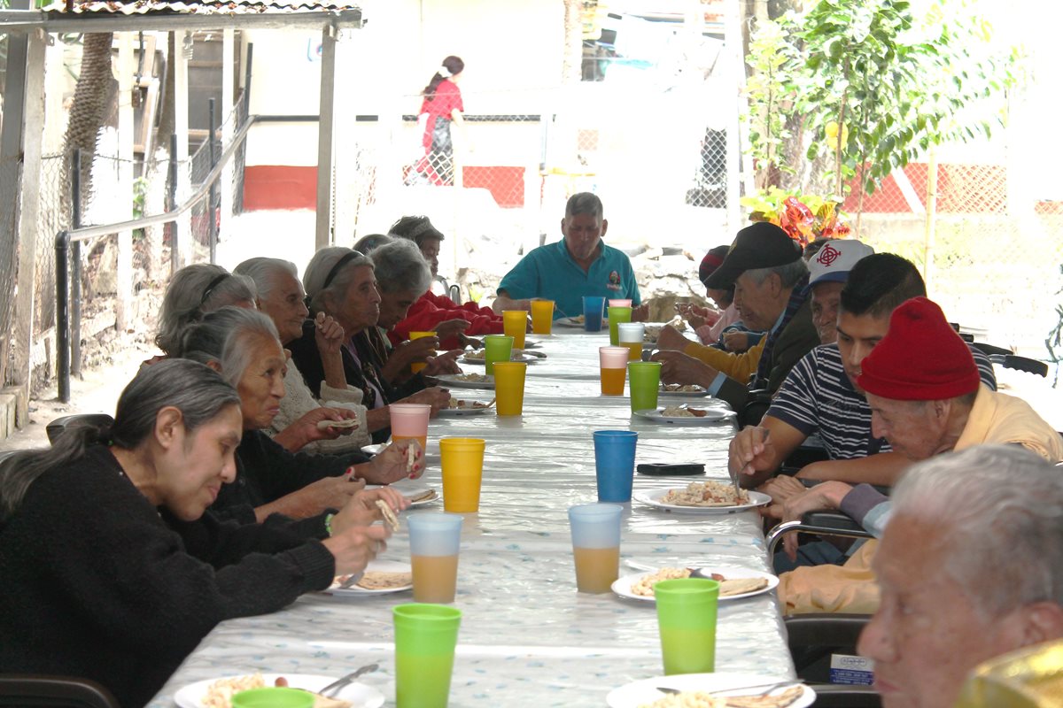 Coditos, salchichas y dos tortillas, son el menú del día. Al compás de la marimba, los abuelitos degustan los alimentos.