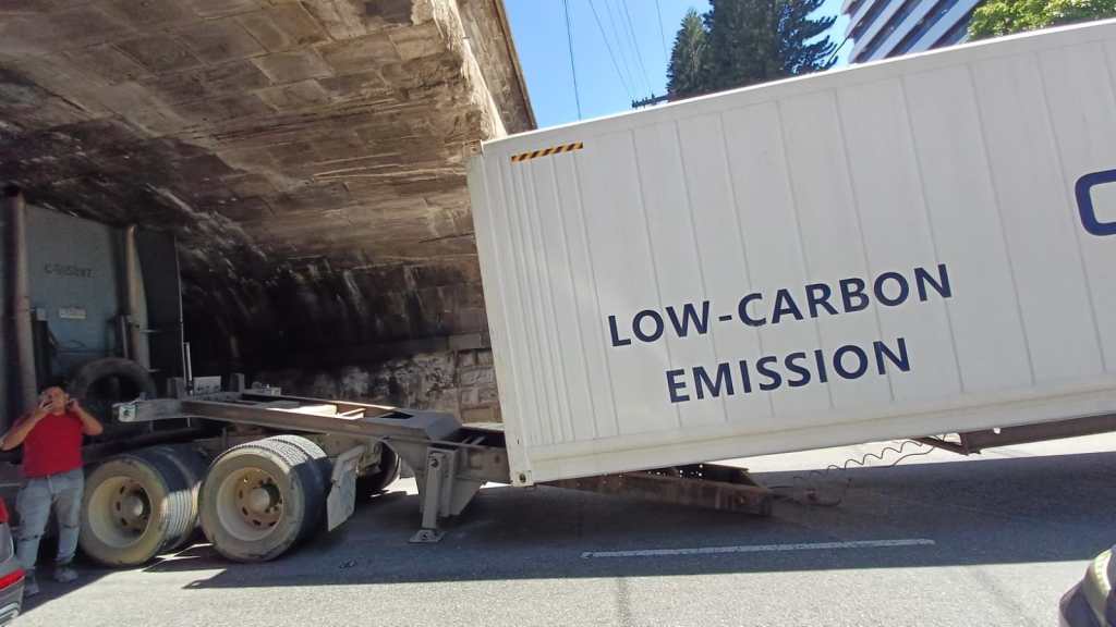 El furgón y el cabezal quedaron atrapados bajo el puente, obstruyendo el carril izquierdo y afectando el tráfico por varios minutos.
