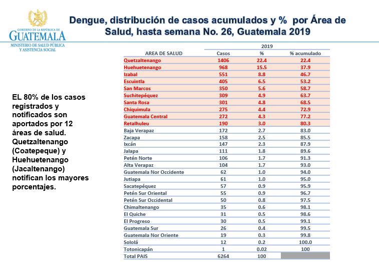 Quetzaltenango es el departamento que encabeza la lista de las unidades de salud con más reportes: 1 mil 406 contagiados, lo que representa el 22% del total de casos, siendo el municipio de Coatepeque el que notifica mayores porcentajes. En Huehuetenango se contaban hasta la última semana de junio 968 pacientes con dengue, que equivale al 15% de reportes, es Jacaltenango el más afectado.