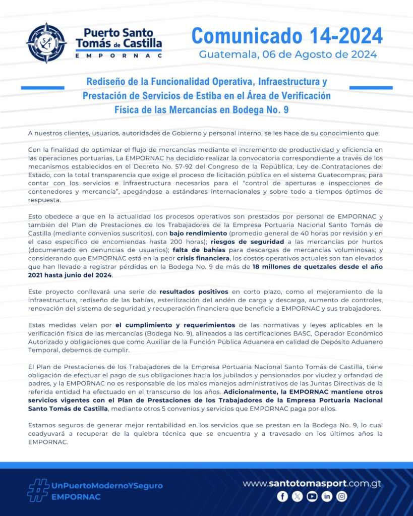 La Empresa Portuaria Santo Tomás de Castilla emitió un comunicado en el que detalla el “rediseño de la funcionalidad operativa, infraestructura y prestación de servicios de estiba en el área de verificación física de las mercancías en bodega 9”.