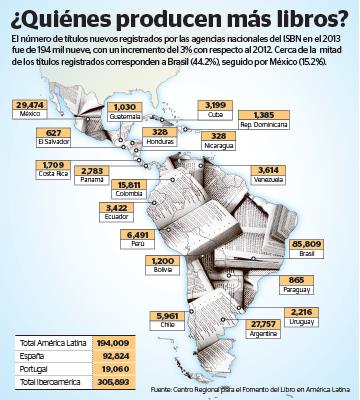 Según El libro en cifras de la CERLAC, la cantidad de títulos registrados por las agencias nacionales del ISBN durante el 2013 fue de 194 mil nueve, lo que representa un incremento de 3 por ciento con respecto al 2012.
