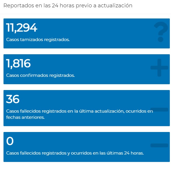 Salud detalla que en las últimas horas se practicaron 11 mil 294 pruebas, de las cuales 1 mil 816 dieron positivo para covid-19.