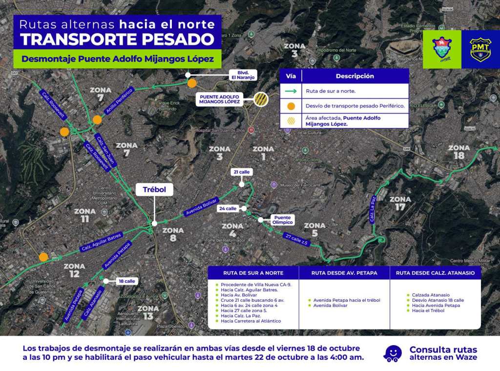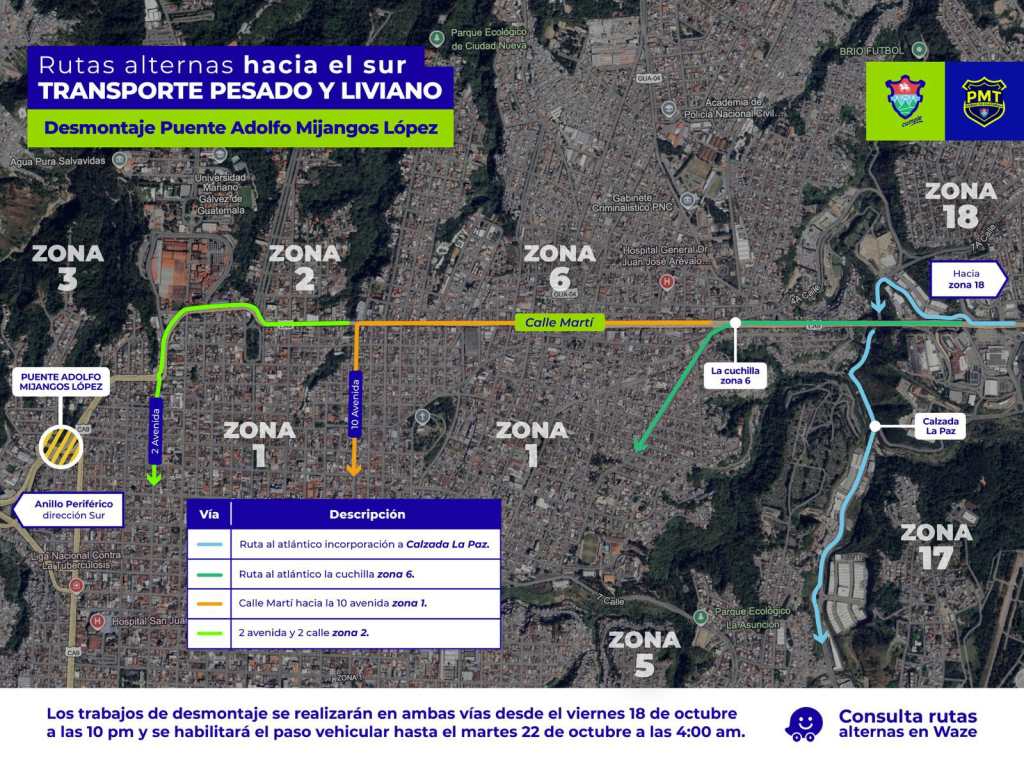 La Municipalidad de Guatemala dio a conocer que del viernes 18 al martes 22 de octubre el paso en el anillo Periférico y zona 3 capitalina estará cerrado por la construcción del nuevo puente Adolfo Mijangos López.