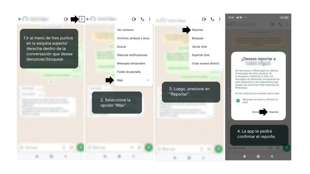 - La app preguntará si desea reportar a ese remitente, avisando que se reenviarán a WhatsApp los últimos cinco mensajes de este contacto y que este no sabrá nada al respecto.