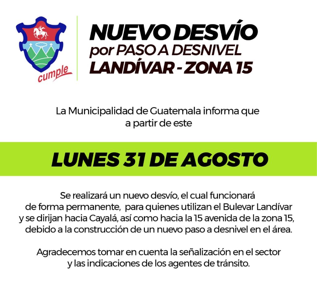 Amilcar Montejo, vocero a la Policía Municipal de Tránsito (PMT), informó que el paso a desnivel se construirá en el Bulevar Rafael Landívar y afectará a los usuarios que vienen del bulevar Vista Hermosa hacia el bulevar Austriaco, estos serán desviados al carril auxiliar que está entre las colonias Buganvilias y Jacarandas de Cayalá.